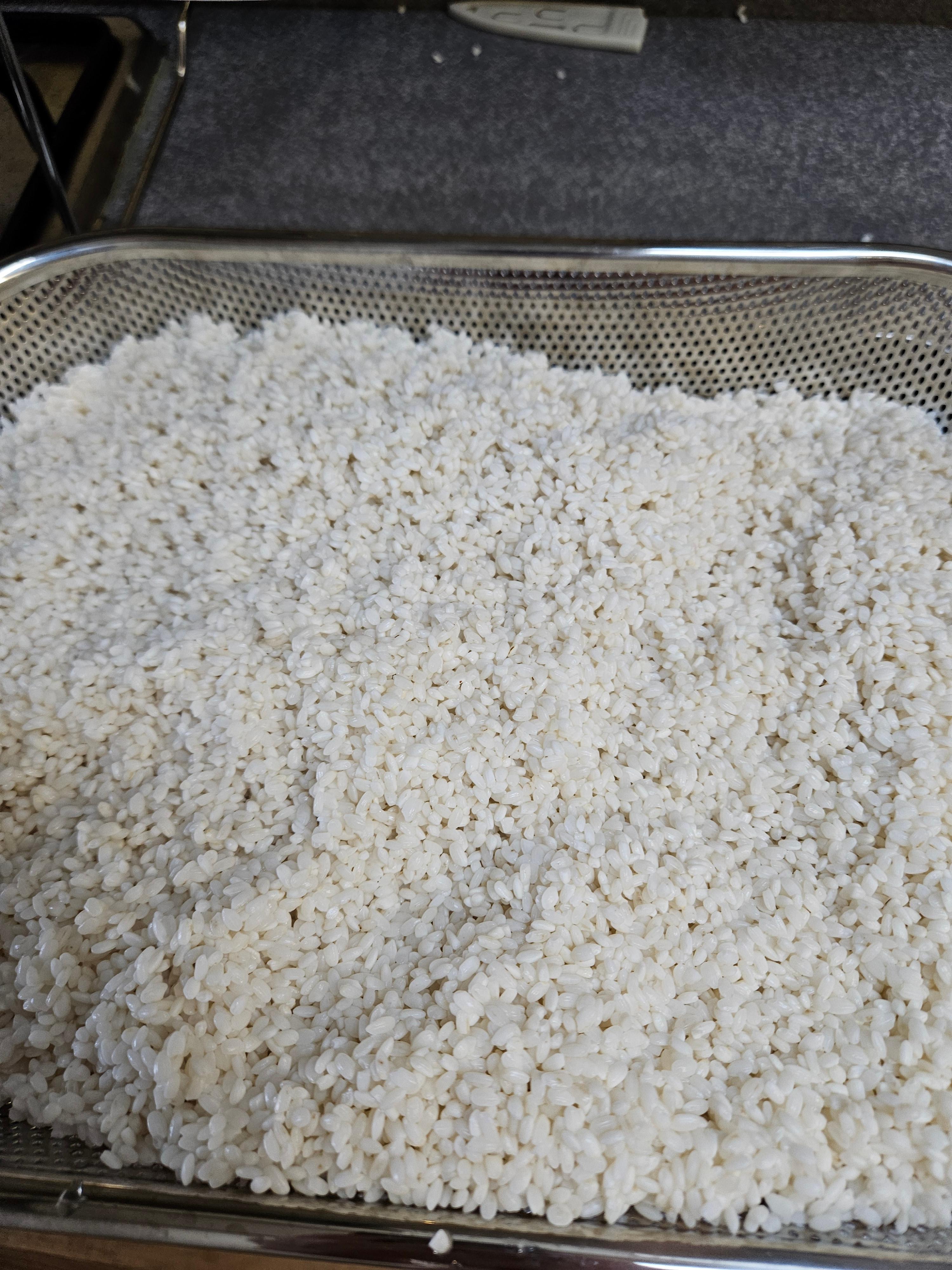 이후 넓은 판에 받혀 뒤집어가면 밥을 차게 식혀줍니다.