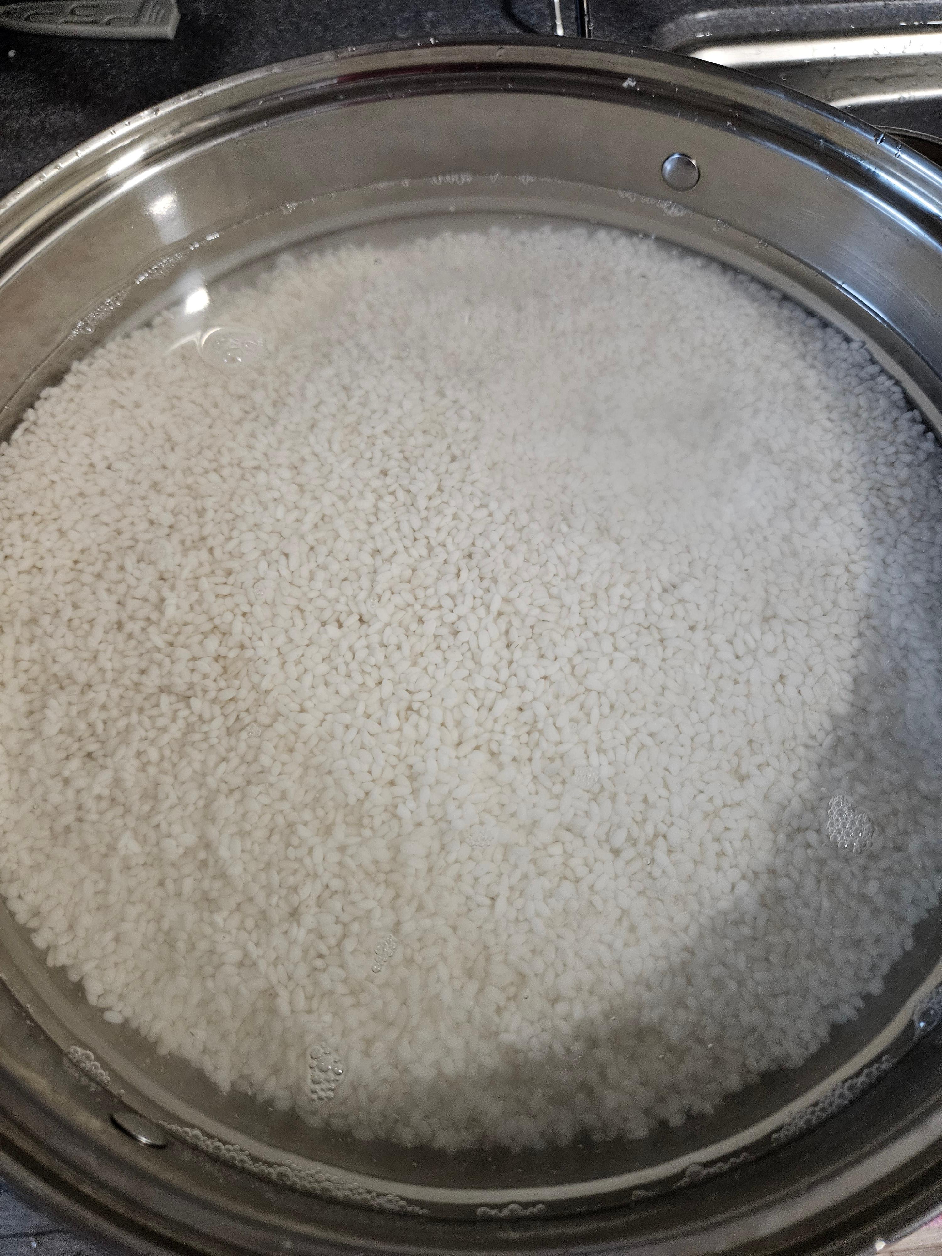 찹쌀 2kg을 맑은 물이 나올때까지 씻고, 정수물에 12시간 불립니다. 이후 30분가량 체반에 받혀 물기를 빼줍니다.
