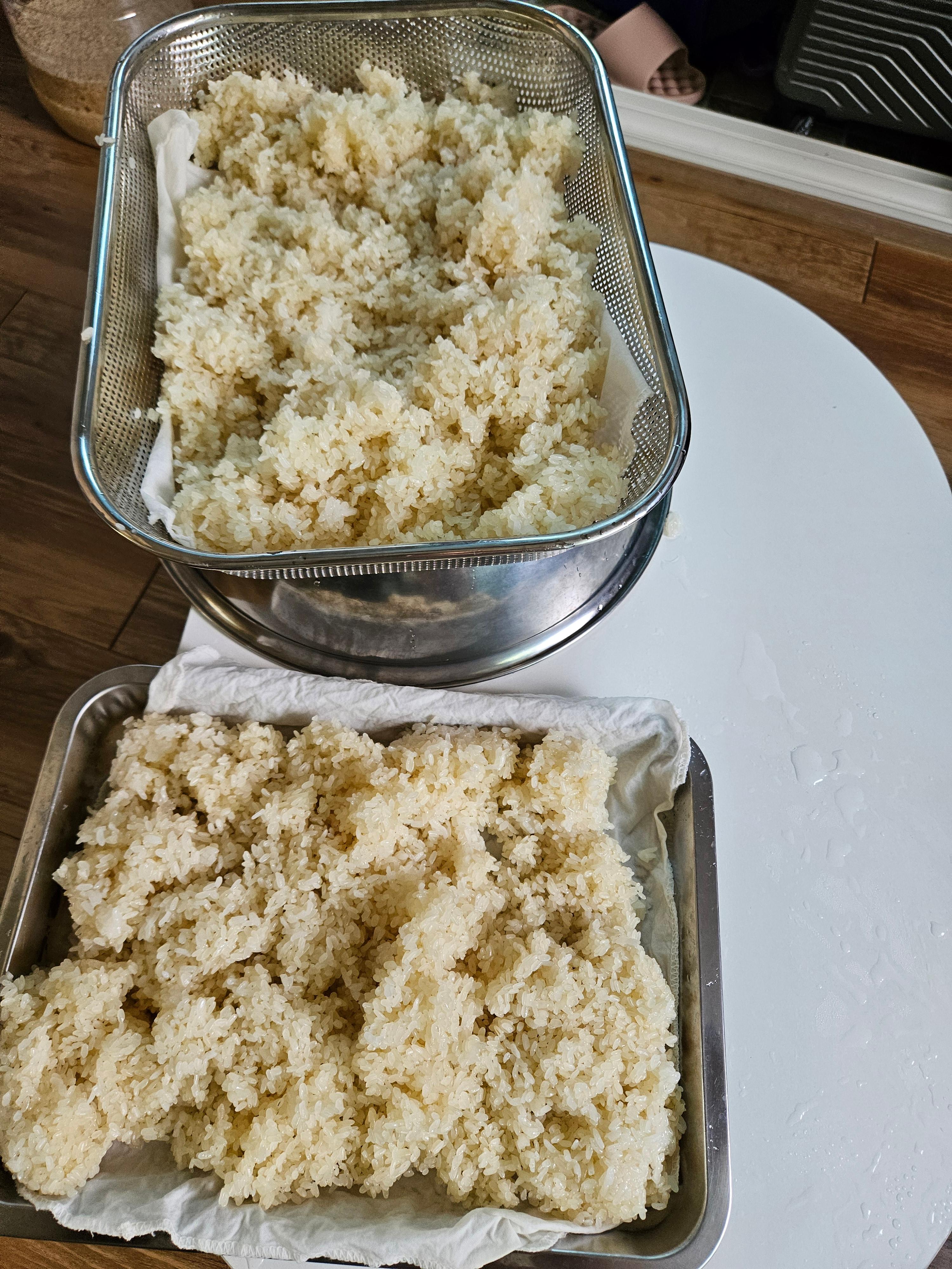 이후 넓은 판에 받혀 뒤집어가면 밥을 차게 식혀줍니다.